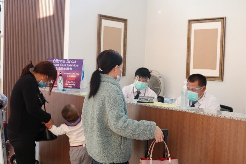 20201120-covid-19-air-travel-counter Passengers queue at a counter inside the terminal to buy bus tickets as designated bus companies are operating the services that will take them to their quarantine hotels at a fee of LAK 50,000 each.