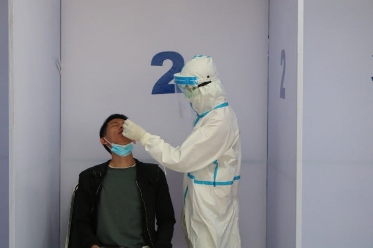 20201120-covid-19-air-travel-sample-collection Health staff wait at the COVID-19 sample collection area