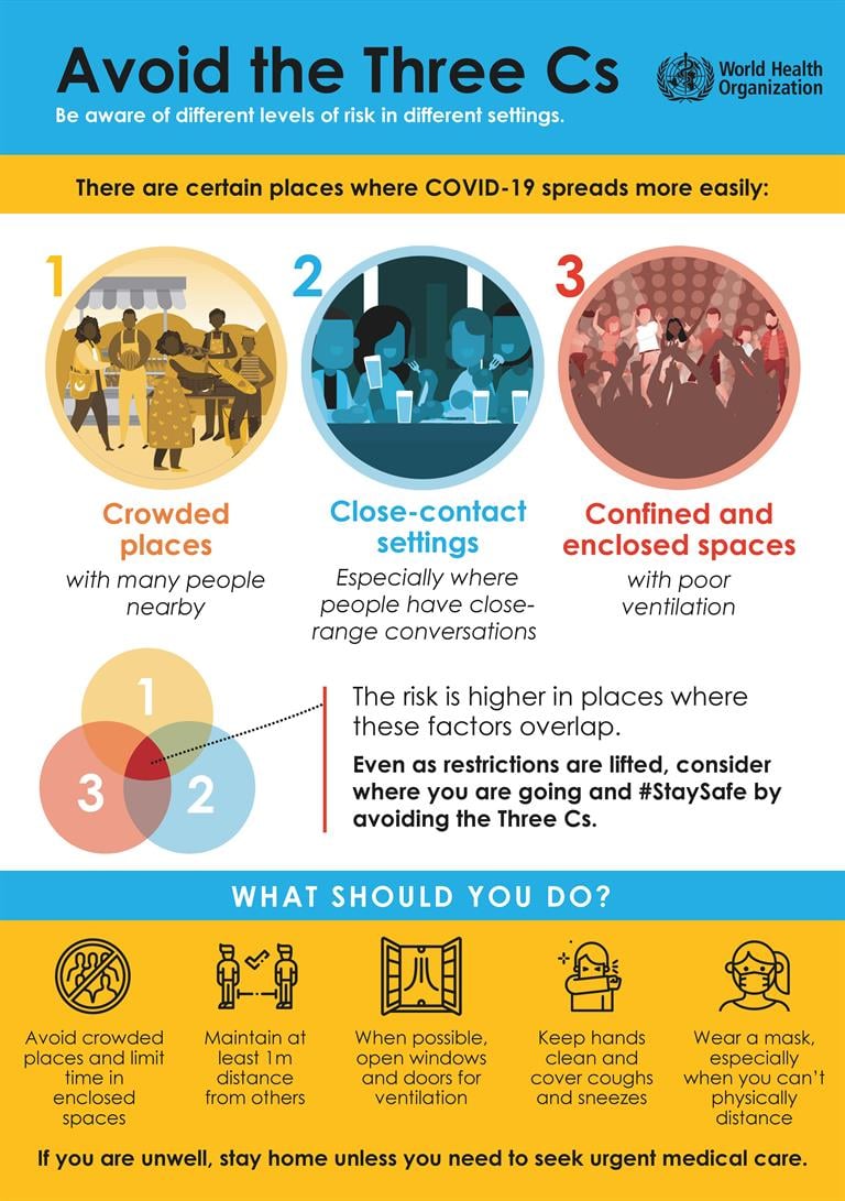 The risk of COVID-19 spreading is especially high in places where these “3Cs” overlap.