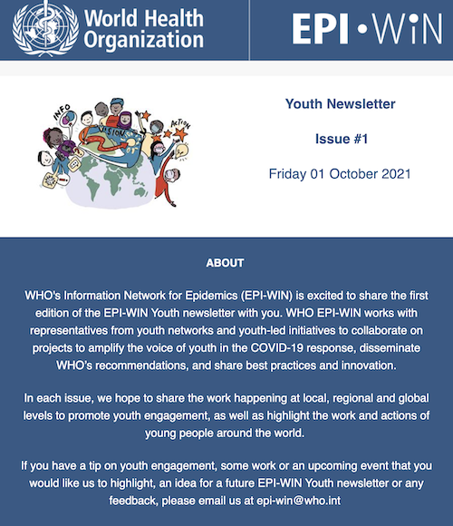 WHO EPI-WIN has been in collaboration with representatives from several youth networks since the start of the pandemic, including the Global Shapers community, the International Federation of Medical Students Associations (IFMSA), the #MoreViralThanTheVirus movement, and the Health and Information Literacy Access Alliance (HILA Alliance - GAPMIL/UNESCO).